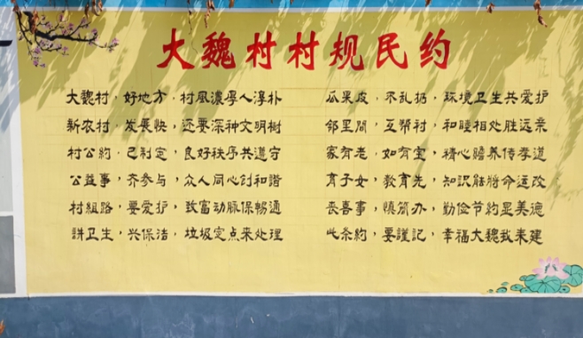 走进大魏村,满眼绿色,盏盏路灯笔直挺立,宽敞平坦的柏油路直通农家小院……呈现在眼前的是一幅美丽新农村画卷。秦都区双照街道大魏村文化广场宣传栏上的村规民约十分醒目。“村组路,要爱护,致富动脉保畅通……此条约,要谨记,幸福大魏我来建。”该村的村规民约在加强村容村貌环境卫生管理、村风民俗等方面作出了重点强调,通俗易懂、朗朗上口的村规民约在群众中口耳相传,村民们渐渐形成了卫生习惯,真正把环境卫生当成了“自家事”。该村先后被评为省级文明村、省级卫生村。